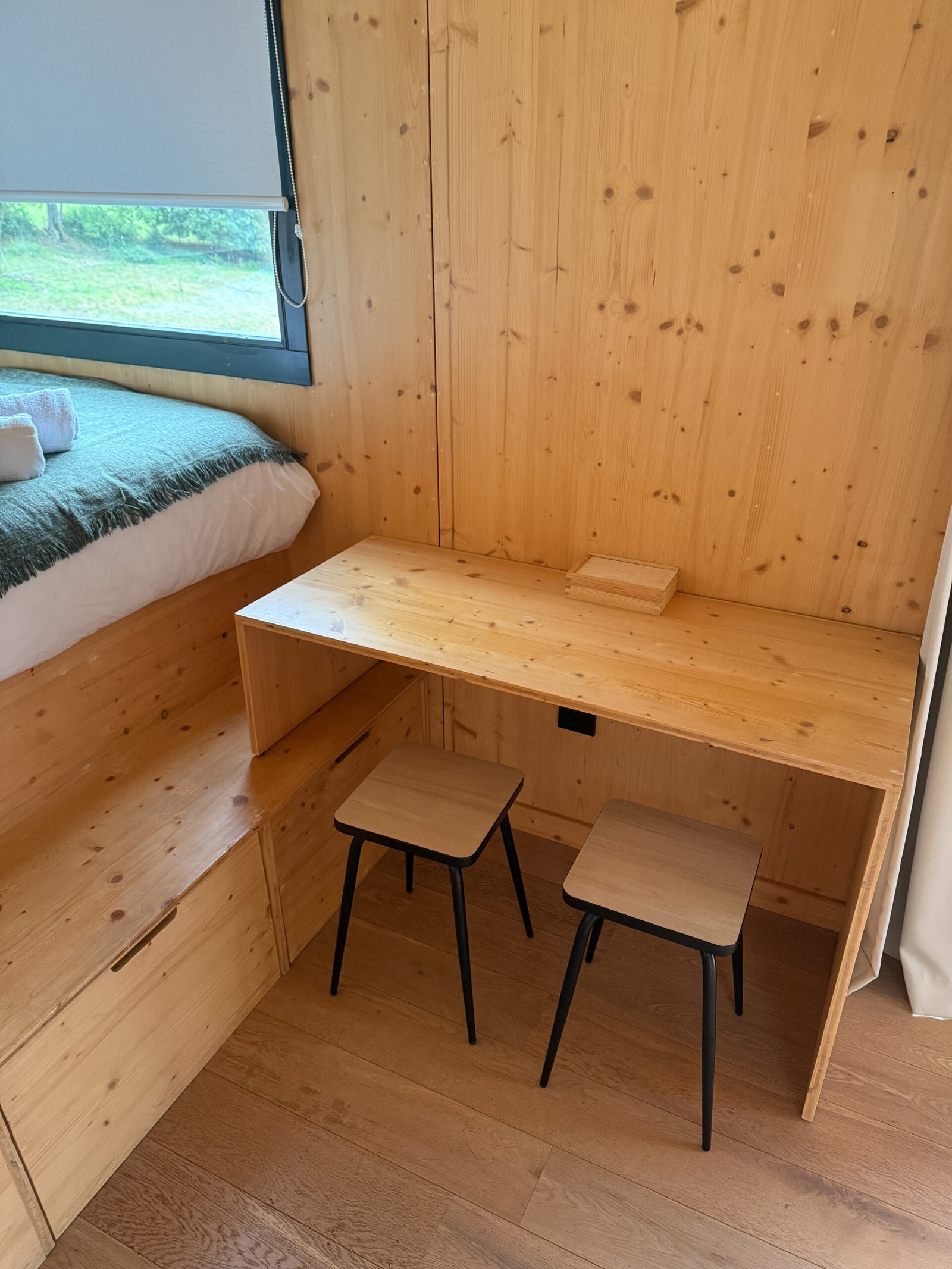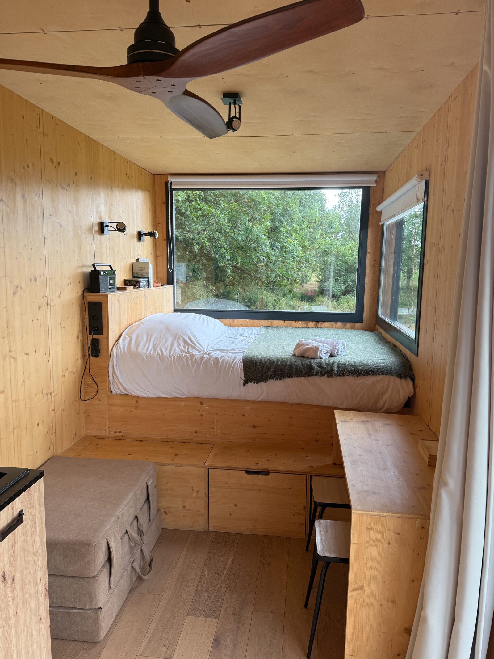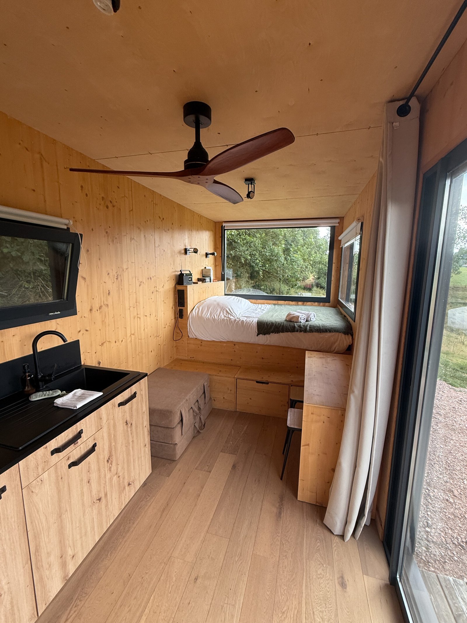 La tiny de la Ferme de la Péa est à l’image du lieu : simple, chaleureuse, efficace. Pas de déco superflue, mais tout ce qu’il faut :